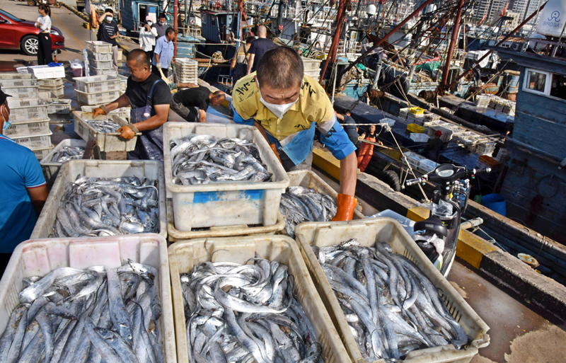 9月7日,在青岛西海岸新区积米崖渔港码头,鱼贩在码头进货选购。