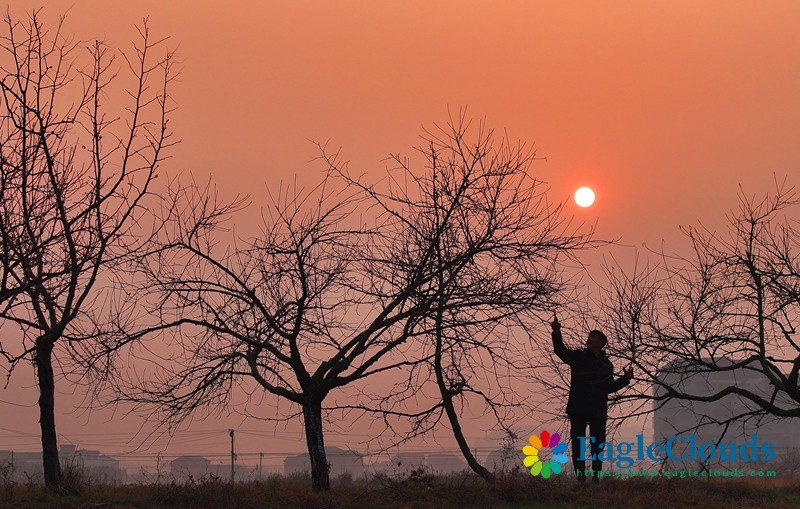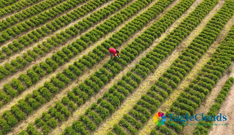 1月5日,在湖南省衡阳市衡山县萱洲镇,村民在给桃树剪枝(无人机照片)。