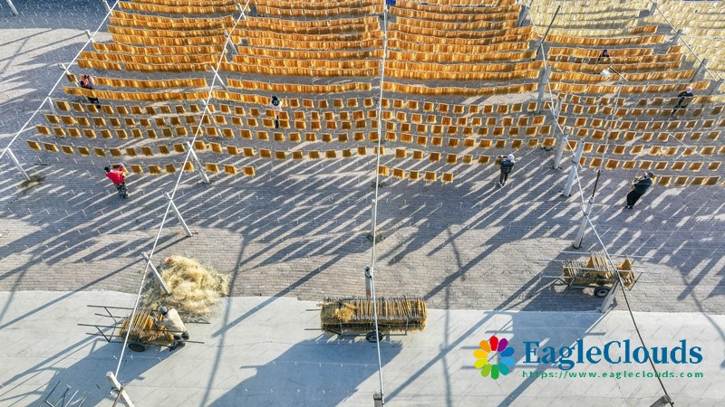 1月5日,农民在河北省遵化市一家粉条加工专业合作社的场院晾晒粉条(无人机照片)。