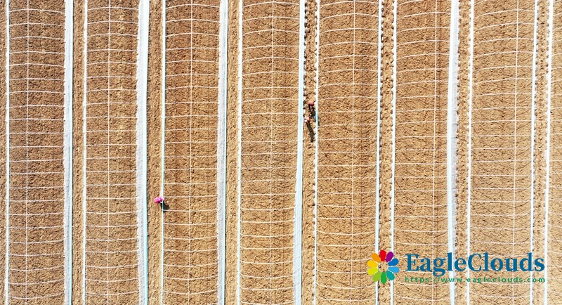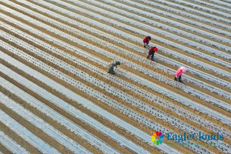 1月5日,湖南省衡阳县关市镇鑫粤农业生态蔬菜种植基地,村民在给蔬菜苗破膜(无人机照片)。