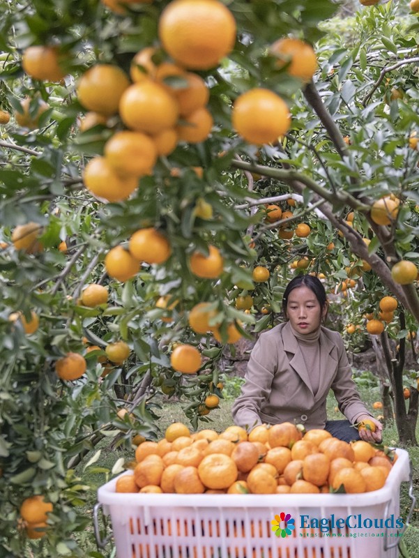 1月5日,在云南省文山壮族苗族自治州西畴县兴街镇江龙村果园基地,农民在采摘、装运柑橘。