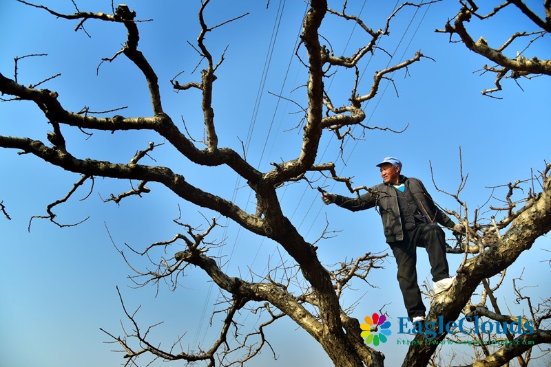 1月5日,山东省枣庄市山亭区水泉镇朱庄村农民在果园修剪桃树。