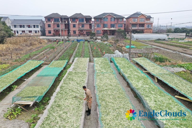 1月5日,在浙江省湖州市德清县乾元镇金火村,村民在翻晒冬菜(无人机照片)。
