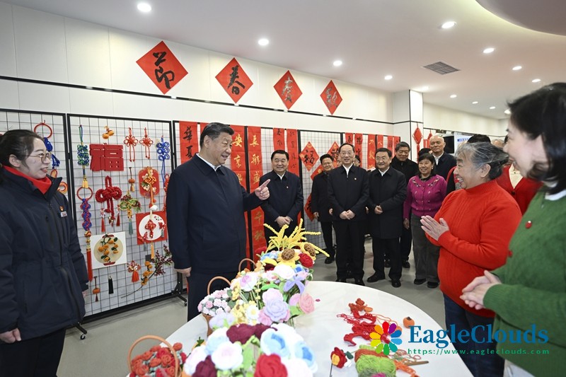 社区党群服务中心里,一些社区居民在写春联,孩子们编着中国结。习近平来到他们中间,不时赞赏他们的作品,勉励他们更好传承弘扬中华优秀传统文化。习近平还饶有兴致地欣赏了社区退休人员表演的笛子合奏曲。他深情地对大家说,过好春节意味着新一年有一个好的开端,家家户户幸福生活、老老少少开心快乐,就是人间美景。我们要一起努力,让这美景越来越靓丽。