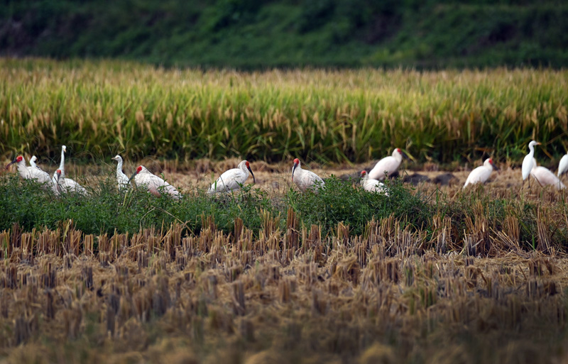 9月10日,朱鹮和白鹭在洋县纸坊街道周家坎村稻田里停歇。