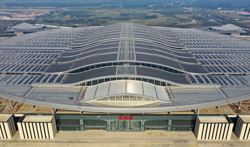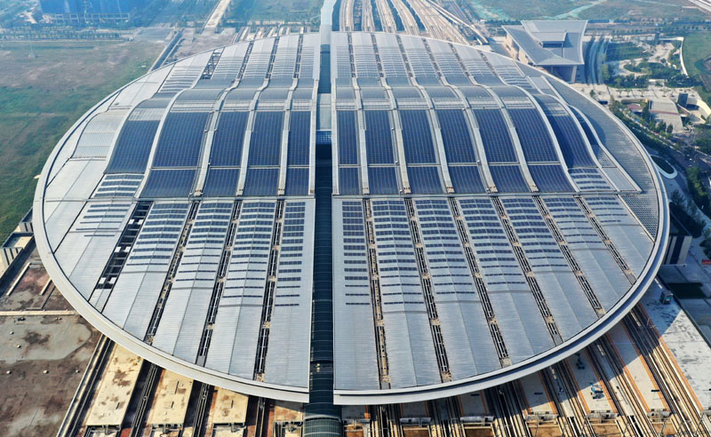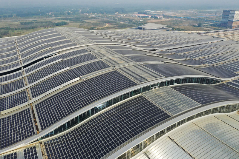 京雄城际铁路雄安站站顶分布式光伏电站总装机容量6000千瓦,站顶铺设1.77万块、4.2万平方米多晶硅光伏组件,电站采用自发自用、余电上网模式,自2020年12月正式并网发电以来,已累计发电超过1000万千瓦时。