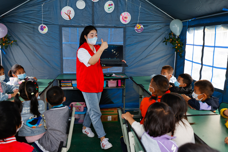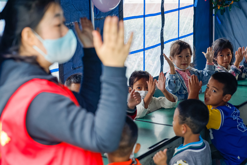 四川泸定地震发生后,泸定县第二中学校成为临时安置点,安置了受灾严重的得妥镇的800多名村民,其中约有50名孩子。自9月6日开始,11名来自泸定县幼儿园和冷碛镇幼儿园的老师带领10名大学生和高中生组成志愿者服务团,在提供志愿服务的同时照料、陪伴这些孩子。