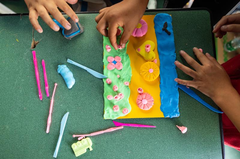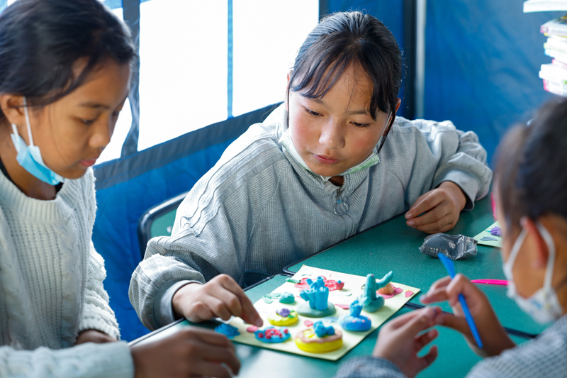 9月10日,在泸定二中临时安置点的“帐篷课堂”里,来自得妥镇的孩子们用橡皮泥制作创意“月饼”。