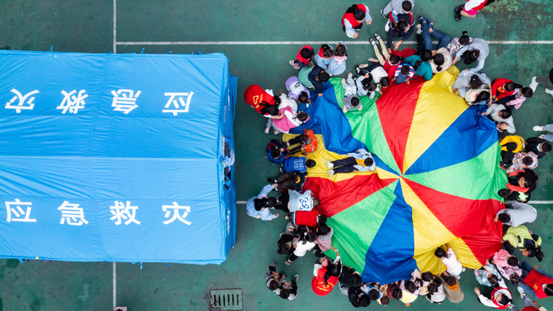9月10日,在泸定二中临时安置点,孩子和志愿者一起玩彩虹伞游戏(无人机照片)。
