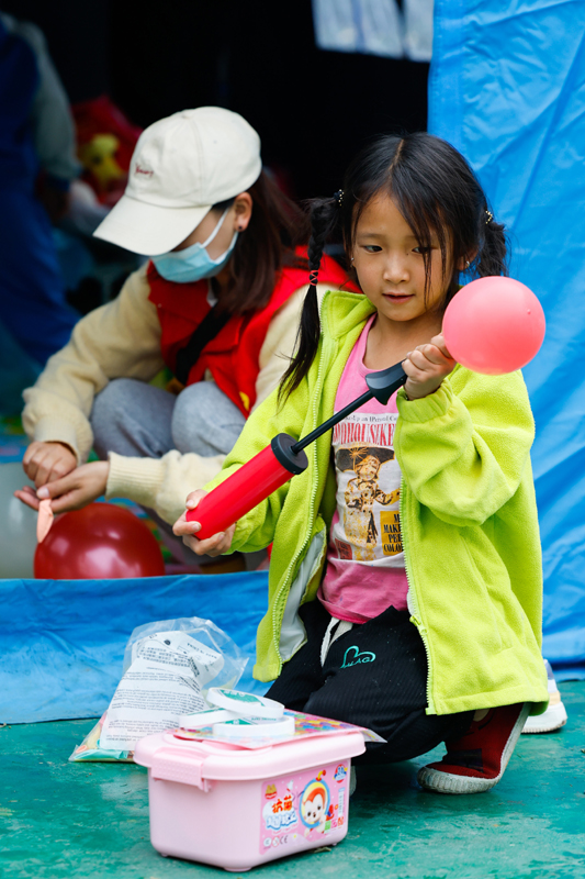 9月10日,在泸定二中临时安置点,一名来自得妥镇的小朋友在帮志愿者打气球。