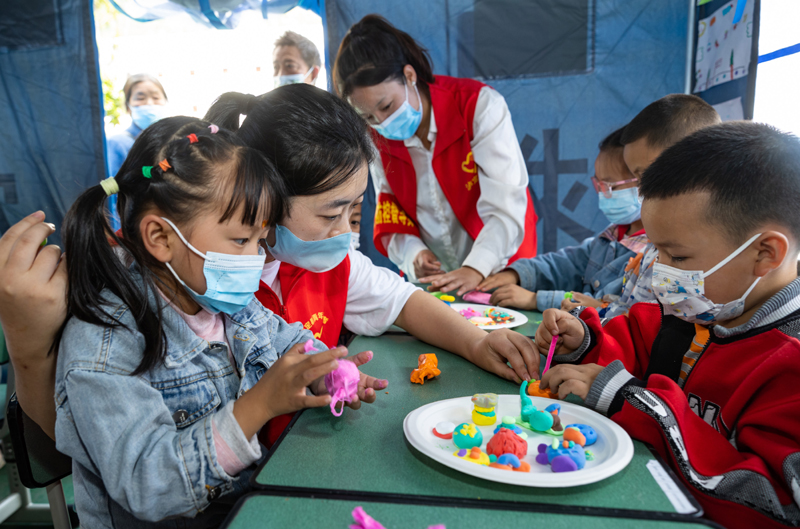 9月10日,在泸定二中临时安置点的“帐篷课堂”里,老师志愿者辜晓鑫(左二)和孙燕(左三)与孩子们一起用橡皮泥制作创意“月饼”。