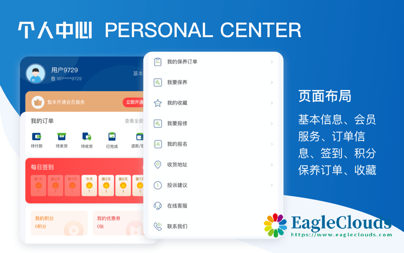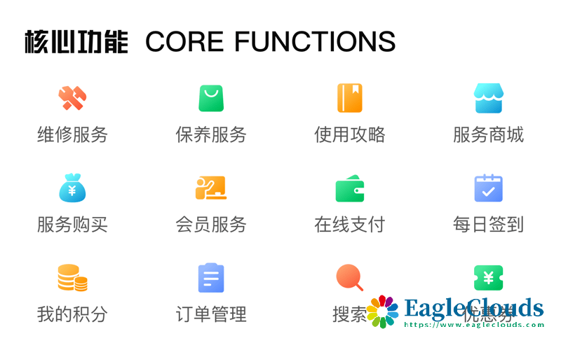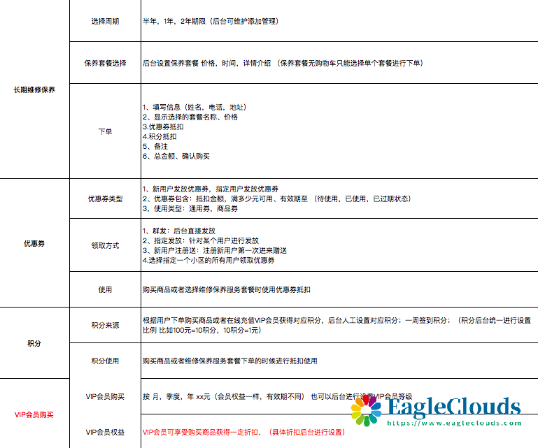 主要用于用户线上提交报修需求清单后台分配安排人员上门维修标记确认订单完成在线服务商城,积分,优惠劵抵扣会员卡管理会员等级服务等。